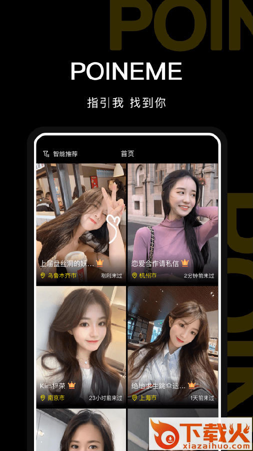 PoineMe,专属年轻人的兴趣交友平台。PoineMe可以根据用户填写的另一半标签需求以及地理位置智能推荐同城帅哥美女,还能在兴趣社区发现更多趣味伙伴,一键发起约会邀请,轻松脱单。...