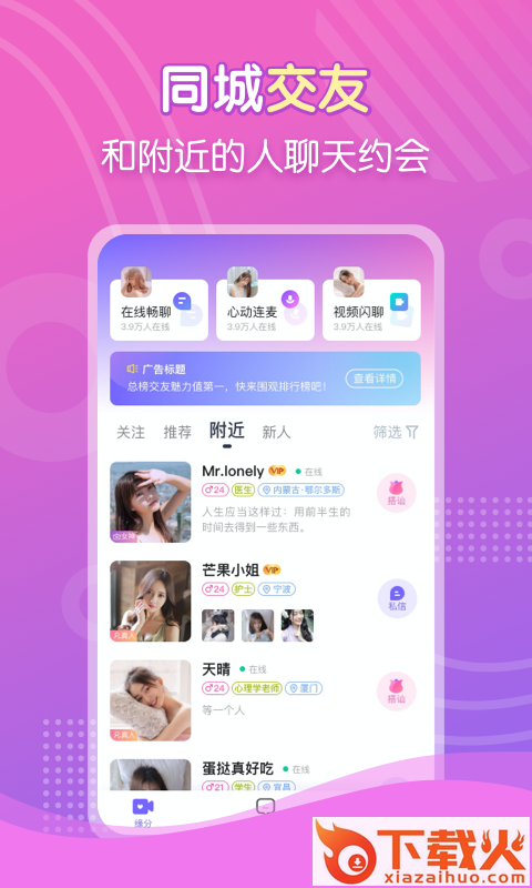 2、快速发现附近的人,快速搭讪聊天,简单高效;