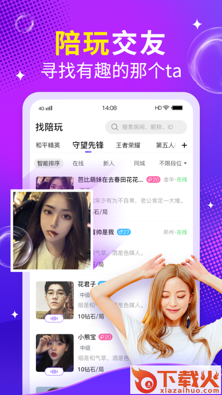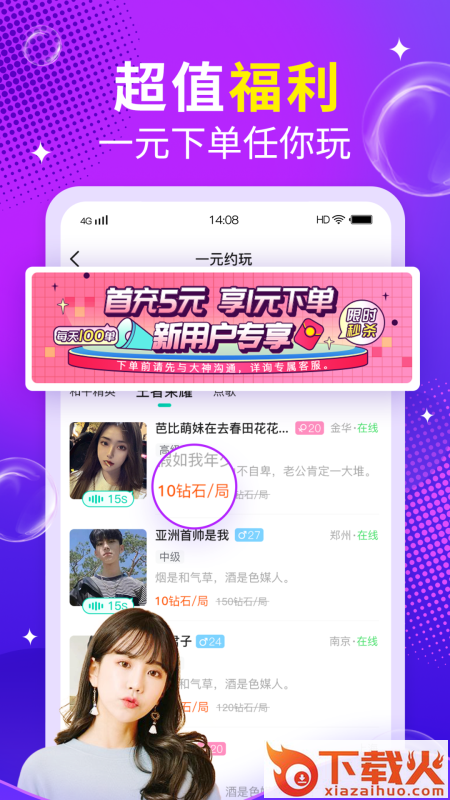 【新人活动】下单即可享一元约玩权益,快来约心仪的小姐姐打游戏吧!另外注册就送五元现金优惠券哦!充值更有超值大礼包等你来领!24小时直播间,活动不停,pick你喜欢的主播,赢取专属头像框。