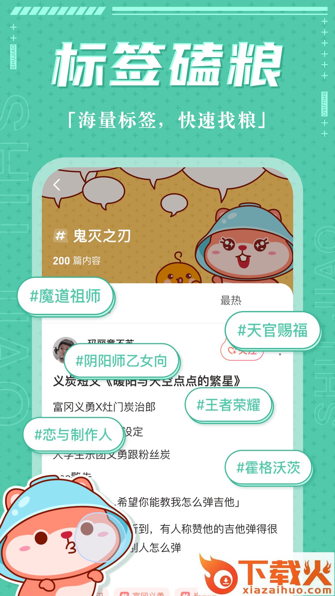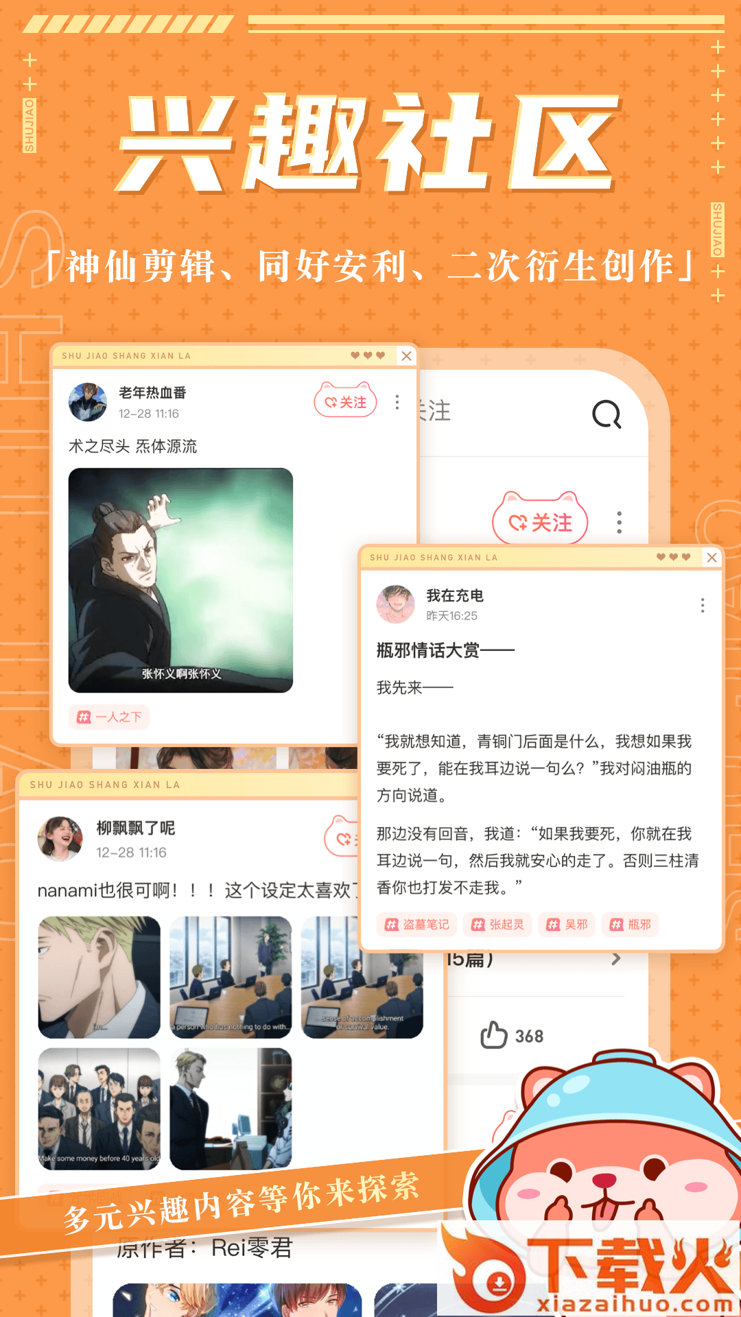 「N多圈子和兴趣标签,快速找到圈内小伙伴」 CP少女、游戏党、原创写手、影视发烧友、神仙COSER、饭圈女孩⋯在薯角,都可以找到承载你兴趣的圈子和同好。