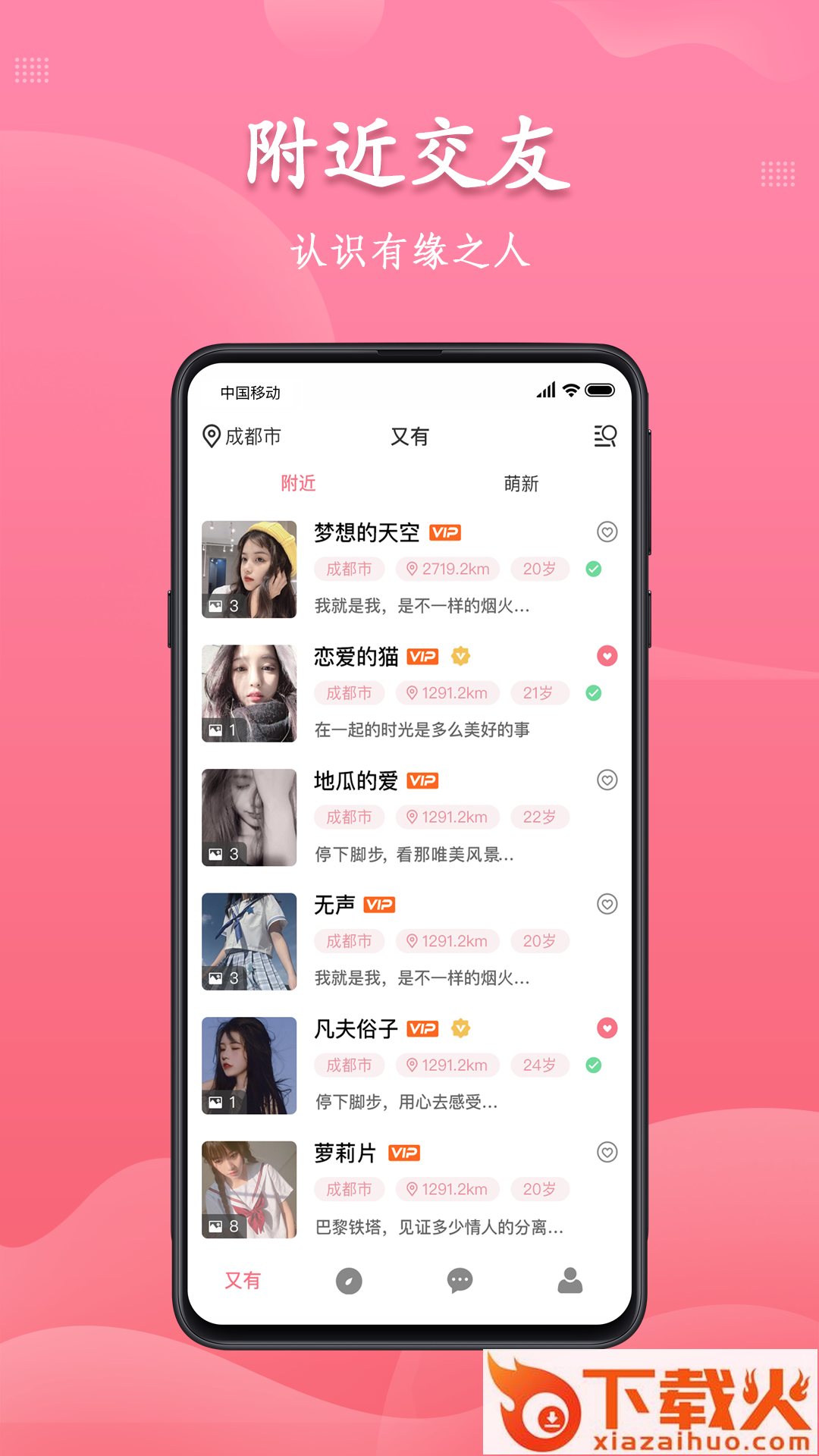 又友交友app,同城陌生人快速交友平台。用户可以通过位置发现周边异性好友,支持个人资料查看,照片、视频,海量动态信息,一键发起语音聊天,快速约会,帮助同城单身找对象。...
