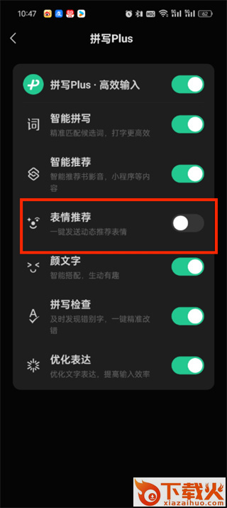 2、点击过后在拼写Plus的页面中只需要点击关闭【表情推荐】后面的按钮即可;