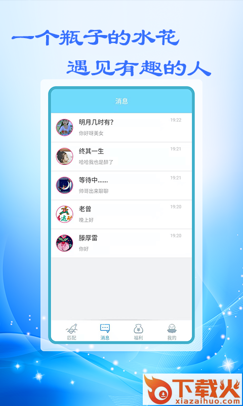 附近漂流瓶app是一款非常好用的手机在线交友互动工具,快速在线为大家带来了优质的的那身资源,在线互动,从此告别孤单。感兴趣的朋友不要错过了,快来下载体验吧。