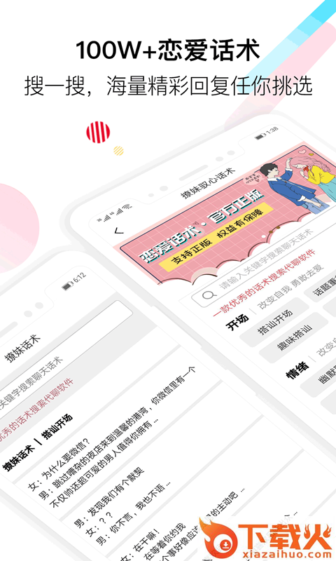 恋爱口才情话是一款非常实用的聊天话术软件,软件功能非常强大,里面提供海量的聊天话术,各种类型的都有,并且会实时更新,用户不知道该怎么聊天的时候,一键搜索,各种精彩回复都有哦!...