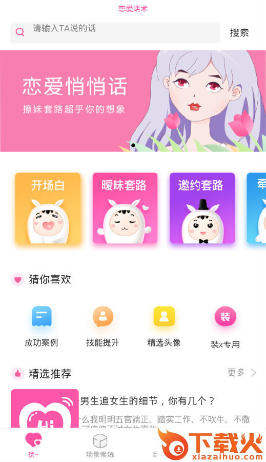 恋爱话术聊天神器app是一款非常专业的恋爱话术软件,这里有上百万条恋爱话术,让你轻松读懂女生话中的隐藏含义,还能查看恋爱实战经验,在线学习话术的运用情况,帮你撩女神,哄女朋友,赶快下载体验吧!...