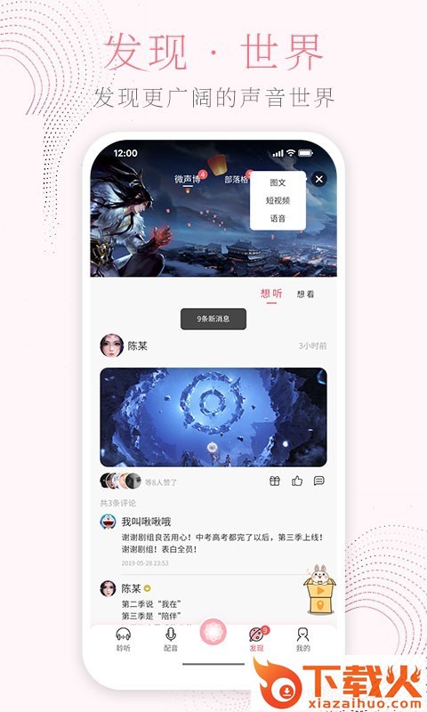 花声社区app下载,一款以声音为主题的互动社交平台,来花声app小伙伴们既可以听书听课,也可以录音配音,更可以用声音交流互动,感兴趣就来下载体验!...