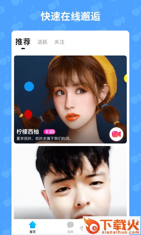 樱桃聊app,拥有快速在线邂逅、高颜优质男女、私密聊天邀约、视频通话等特色,是一款视频聊天交友类软件,让大家在这里可以找到各自喜欢的小伙伴哦!...