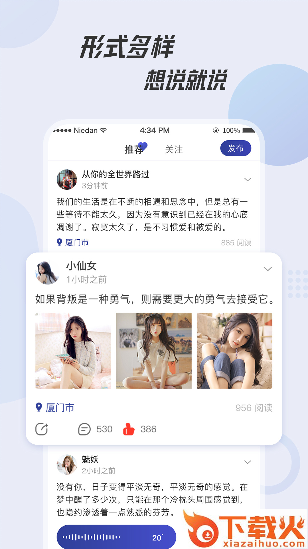 用户能发表文字、图片、视频和语音;