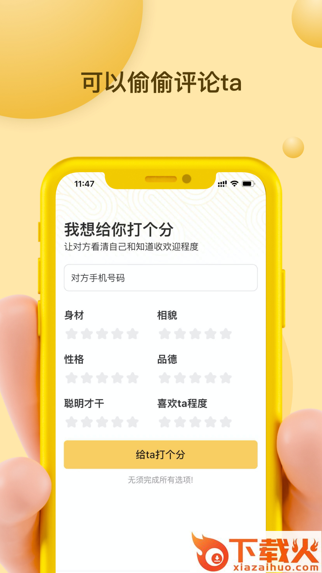 --可以多个维度评价打分指定的手机号码拥有人,并有提示战胜了多少人,并可以分享微信朋友圈