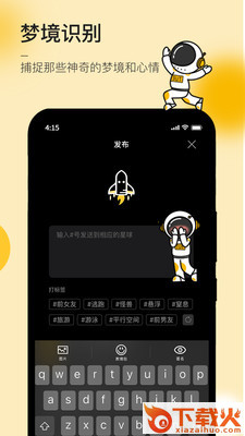 2、发布页面:每晚的睡梦是一场梦境之旅,每个人都是星际宇航员。早上醒来,把这旅行做下记录,将梦境故事发布到梦境星球、梦境社区。未来系统会解锁你的潜意识,甚至引导美梦。