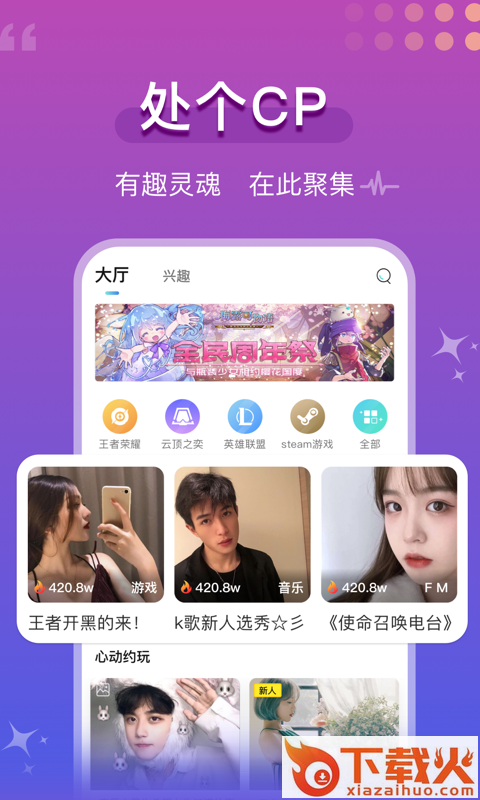 实时声音速配,只要你大胆连麦,声音的邂逅让你告别单身,开启一场浪漫之旅,还能守护你心中的最佳CP,今天就开始