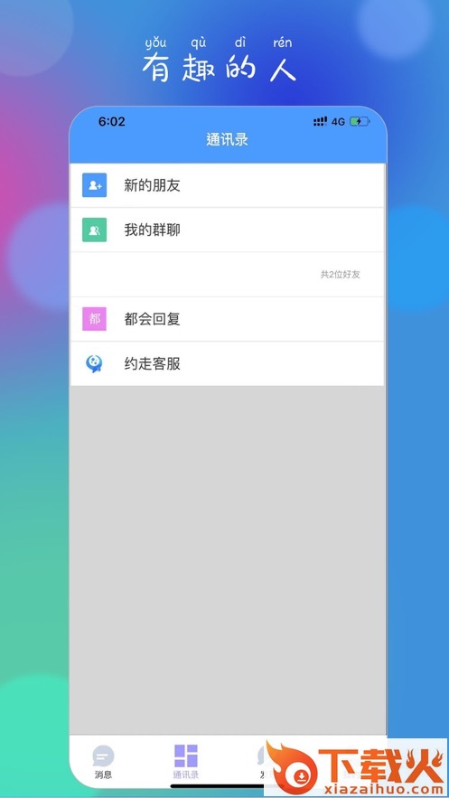 约走是一款简洁的即时通讯软件,其功能有单聊、群聊、文字、语音、表情、图片、视频、红包、转账、名片、视频聊天等。