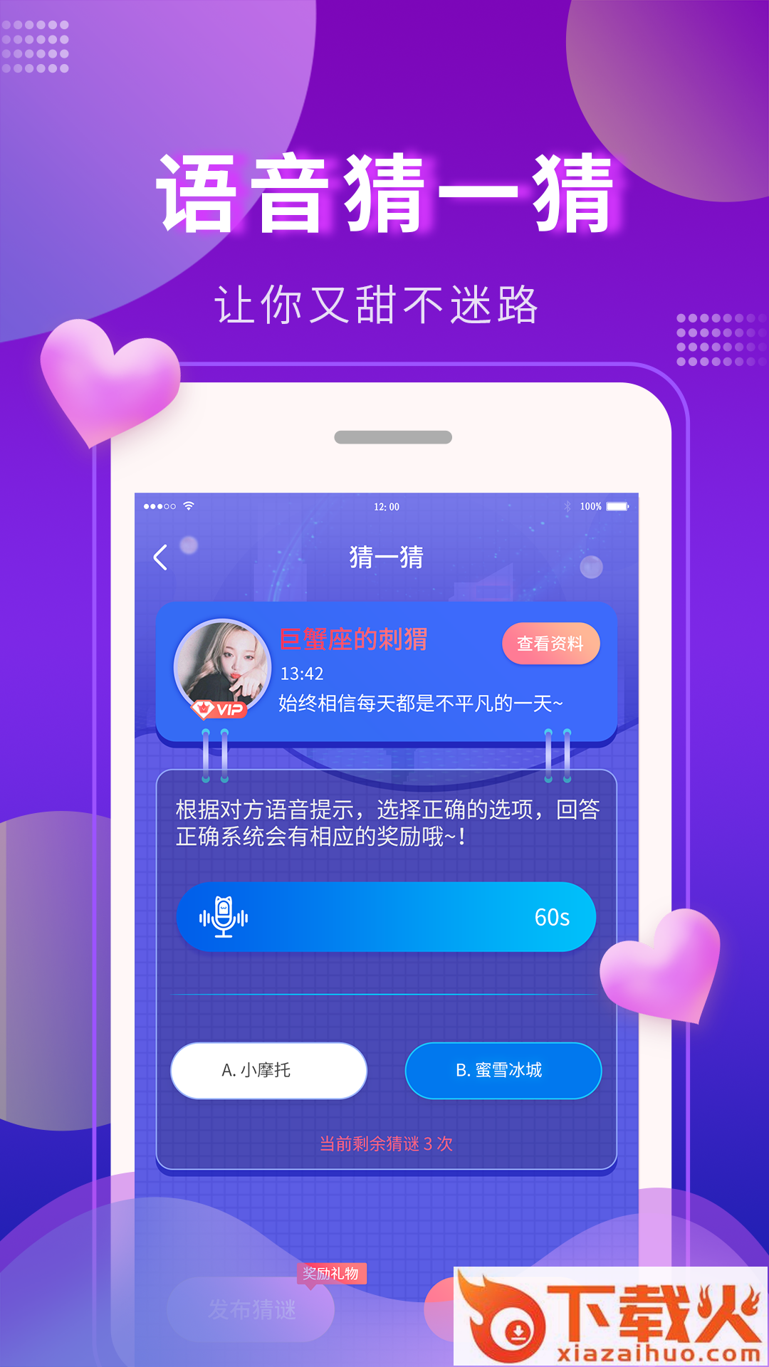拥有语猜交友、语音交友、情书交友、互动聊天等功能,精心挑选让你心动的TA,主动聊天交友,语音聊天,互动型社交聊天的单身交友社交平台。