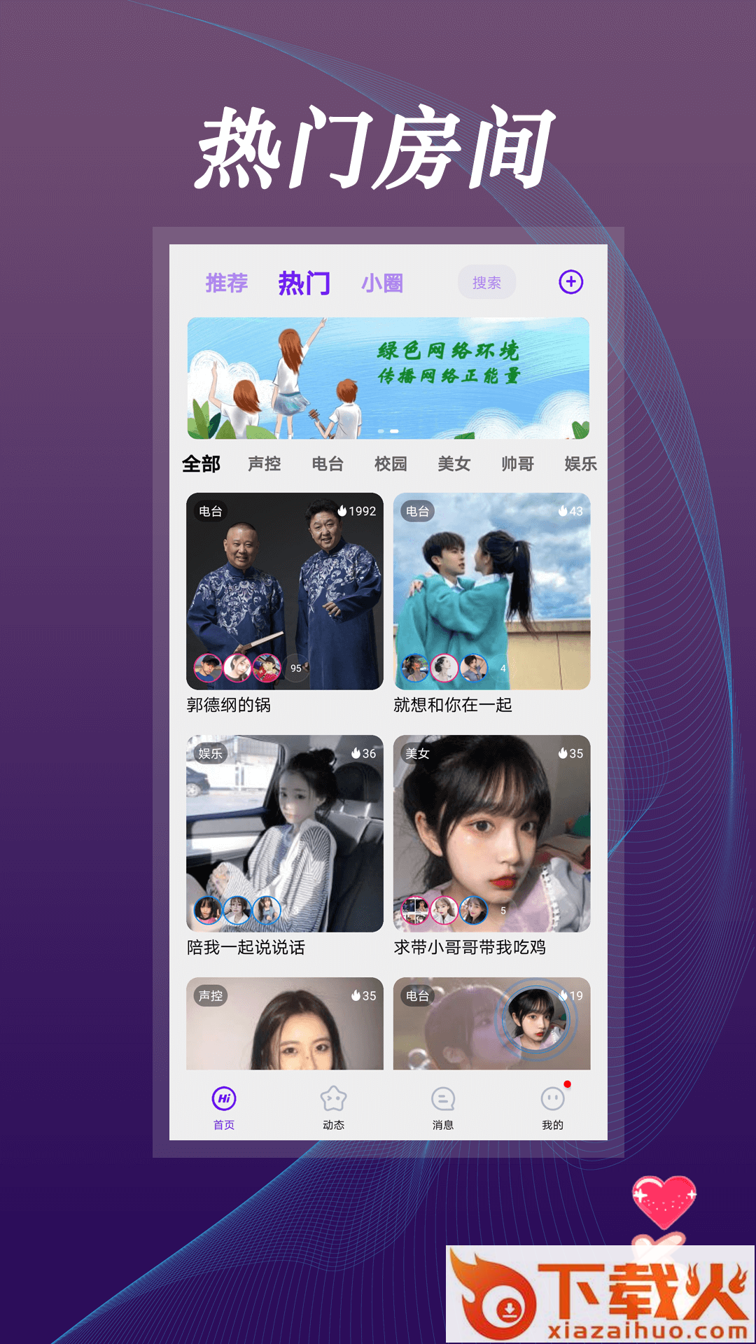 这是一款实时语音互动交友软件,有多才多艺的声控福利电台!汇集众多爱玩陪玩的小姐姐小哥哥。来这里邂逅甜甜的语音恋爱,探秘陌聊。