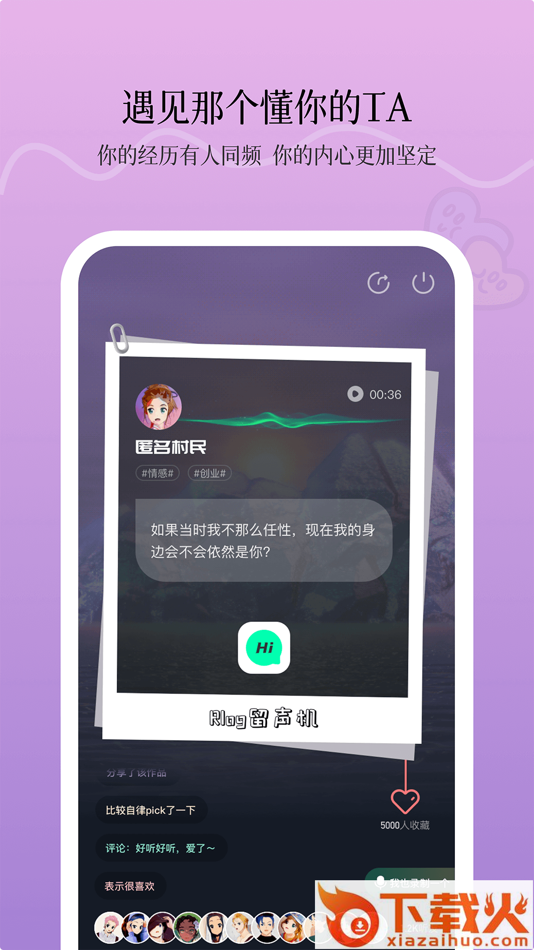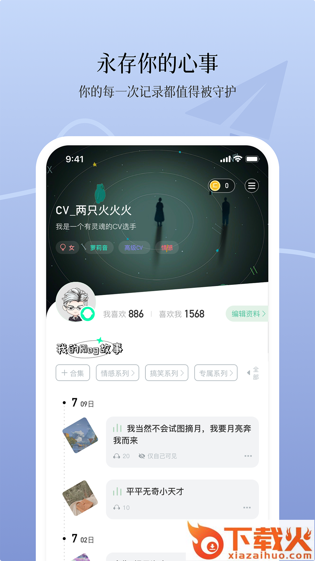 civicivi是一款基于Rlog(Radio Log,声音日志)异时空真人动漫化倾诉社交圈,在当前快节奏、忙碌的时代,建立自己的精神社交圈,敞开心扉,倾诉不为人知的心事,共享到“时空胶囊”。