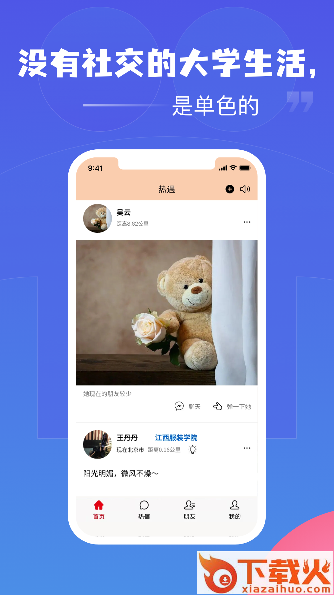 热遇app,高校大学生社交平台,实名认证,信息真实,认识更多同校好友,发现全国高校同龄人,社交更轻松,大学生交友更放心、更便捷。