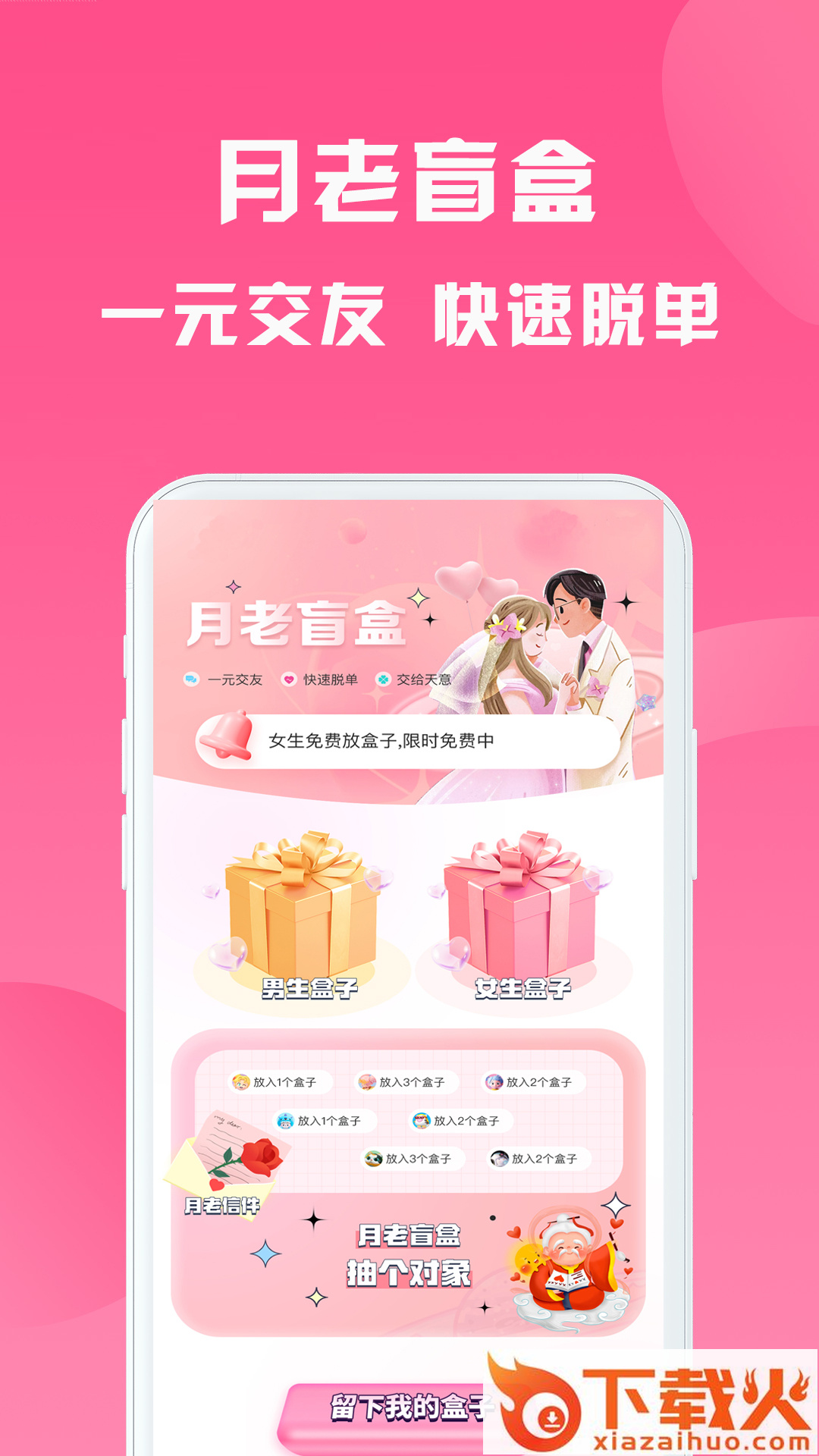 月老盲盒App,拥有一元交友、快速脱单、交给天意等特色服务,为您在茫茫网络中找到您心目中的那个TA,让交友找对象变得更容易,让自己不至于沉落在网络的角落中。