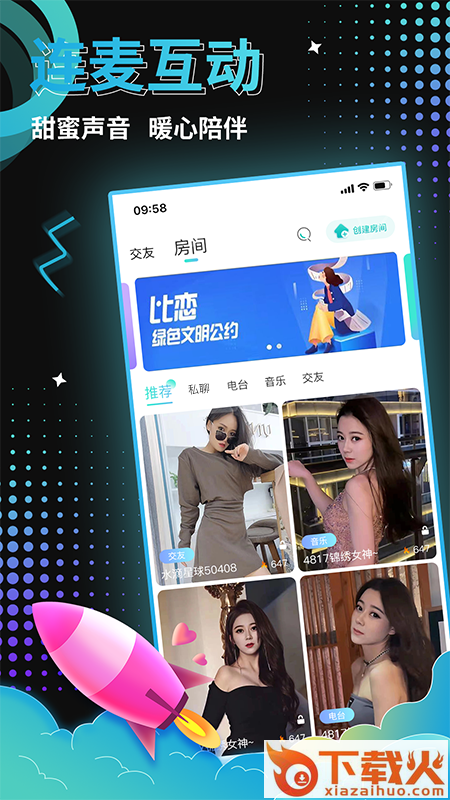 比恋语音app下载,一款有趣好玩的娱乐互动语音聊天平台,来比恋语音app小伙伴们可以随时语音互动,更可以连麦开黑尽情游戏,感兴趣就来下载体验。