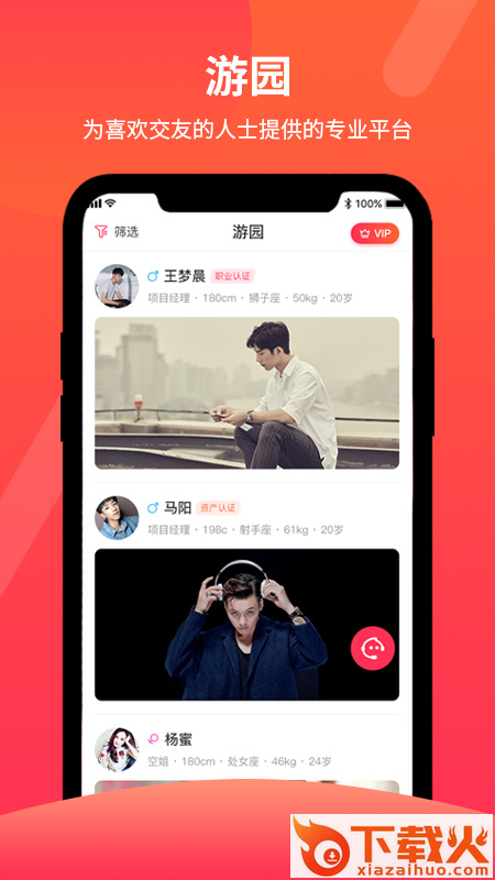 游园 是一款为喜爱交友的人士提供的一个专业平台。在这里,可以快速交友;这里是交友的集聚地,致力于打造最真实的平台,这里承载着我们共同的梦想,无所畏惧、携手畅游!
