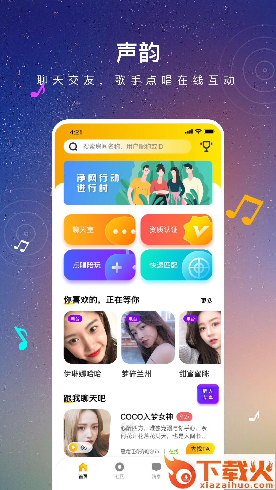 声韵app,语音聊天交友软件,轻松找陪玩,快速交好友,多种趣味互动玩法尽在其中,语音畅聊,放心交友,认识更多更懂你的人,交友、聊天更轻松。