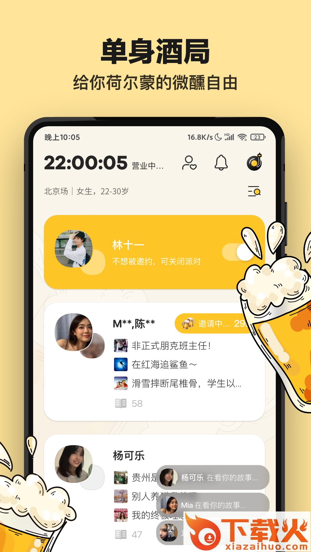 单身酒馆app是一款十分实用的社交聊天软件。这是一家可以装进口袋的酒馆,欢迎单身还有少年感的你~我们有酒更有故事,每晚十点准时营业,希望你能尽情享受自由的时光,也能遇到美好爱情。