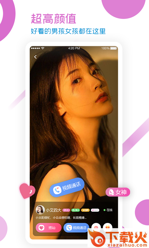 基于视频匹配、语音通话、文字搭讪的交友方式,通过视频和陌生人匹配,促使男女双方感情快速破冰。