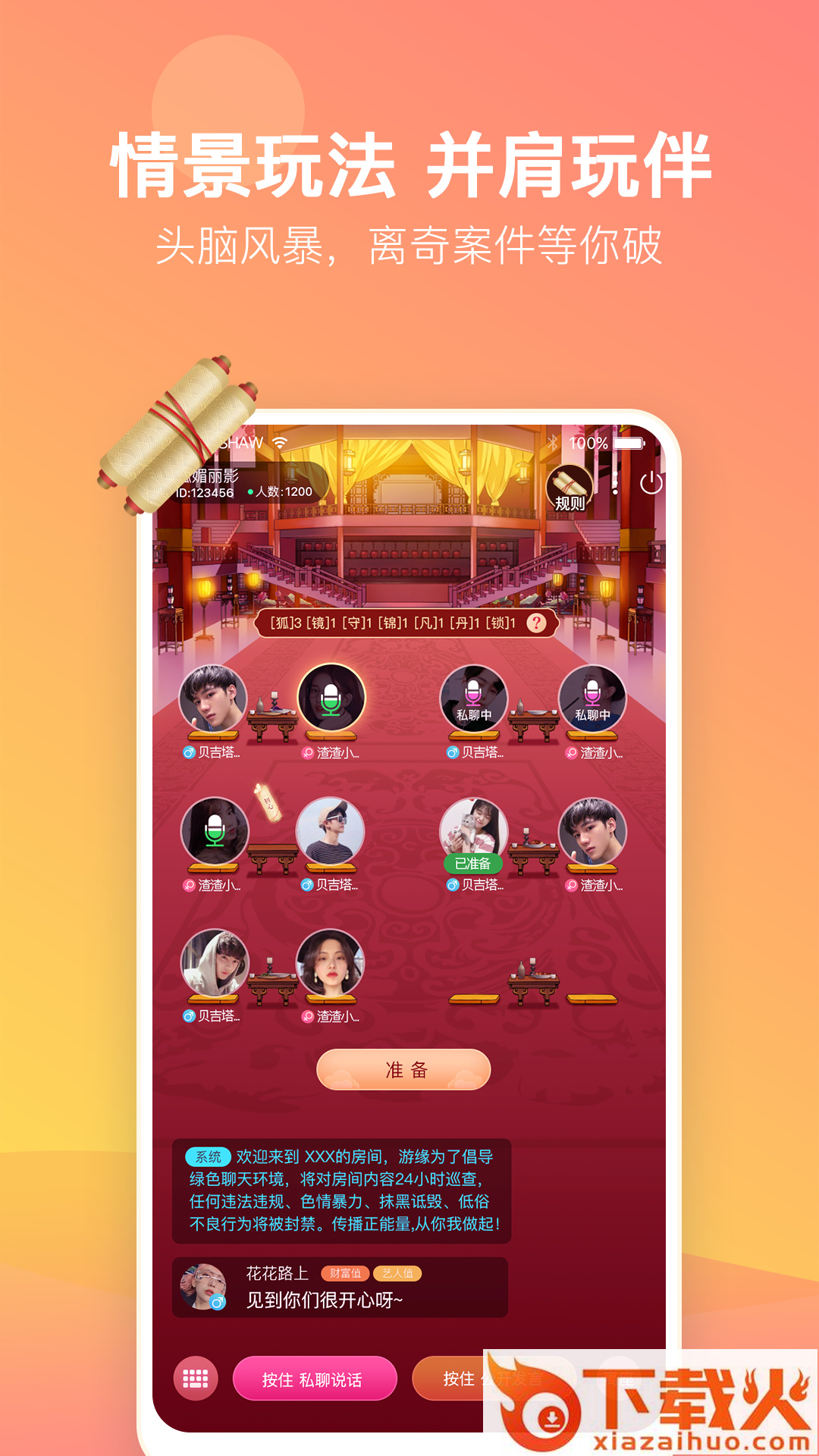 这是一款一对一匹配帮你找到符合你要求的那个TA,速成CP,携手进入情景扮演的剧本角色里一起同游同嗨的语音交友互动平台。