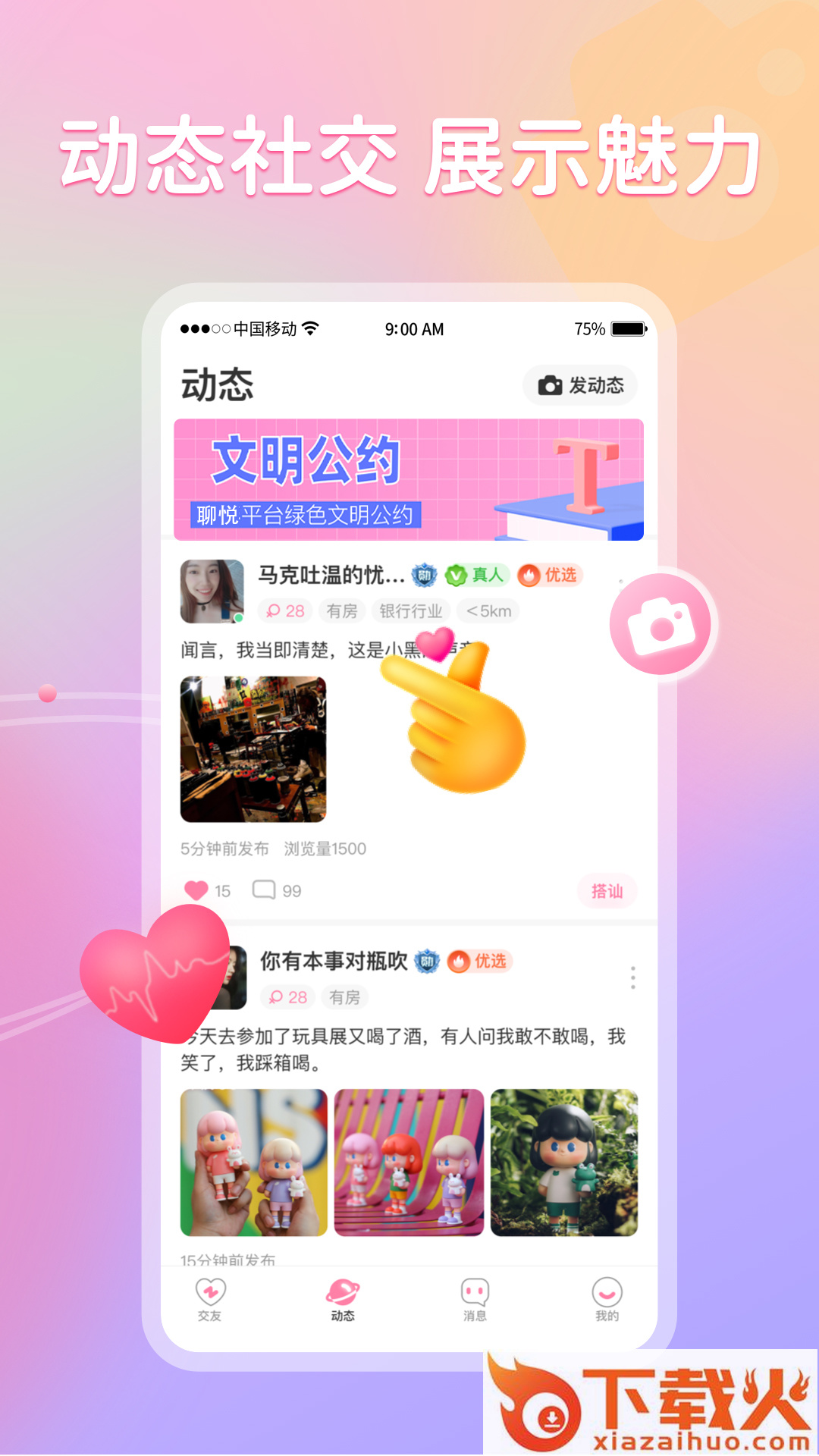 【动态广场】随心发出自己的动态,找到与自己兴趣相投的那个ta。搭讪话题更容易,从此不再社恐。