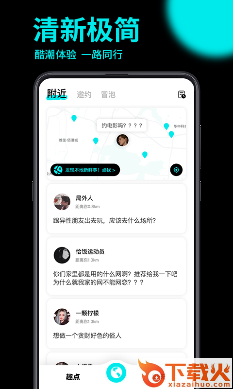 趣点app安卓版下载,为更多小伙伴们提供有趣新颖的LBS社交服务,通过趣点app大家可以和附近的人快速聊天互动,匿名沟通更加轻松,欢迎下载。