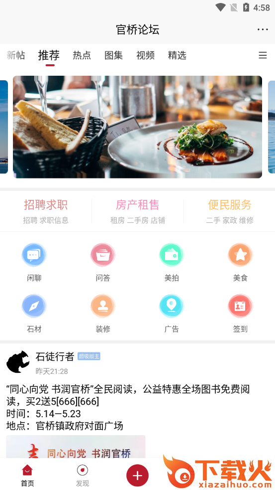 官桥论坛app是一款网络生活社区类社交app,用户可通过app进行社区交流,聊天交友等社交活动,也可以在app上进行点餐、招聘、征婚等,是一款非常优秀的便民生活app。