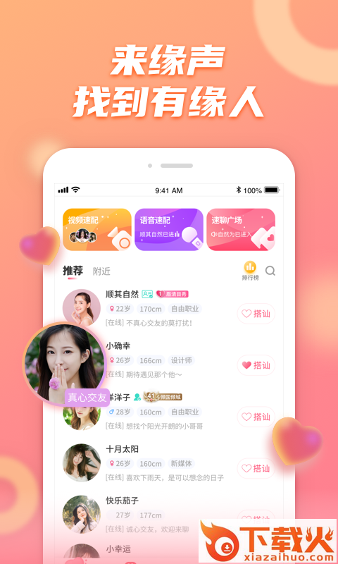 精准速配――基于领先的算法技术,为你推荐最合适的有缘人;语音、视频多种速配方式,直接开始约会,不耽误一分一秒!