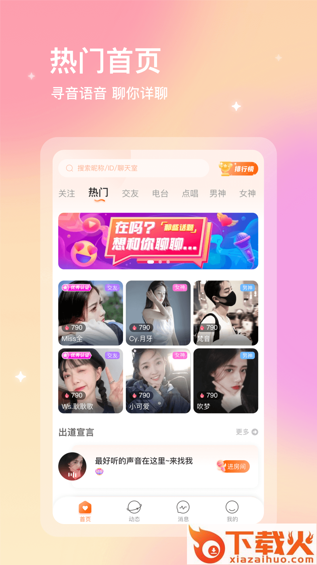 海量在线优质用户,多人语音聊天,你专属的线上派对,用声音魅力展示自己,探探你的那个TA,、线上畅聊,线下约会;