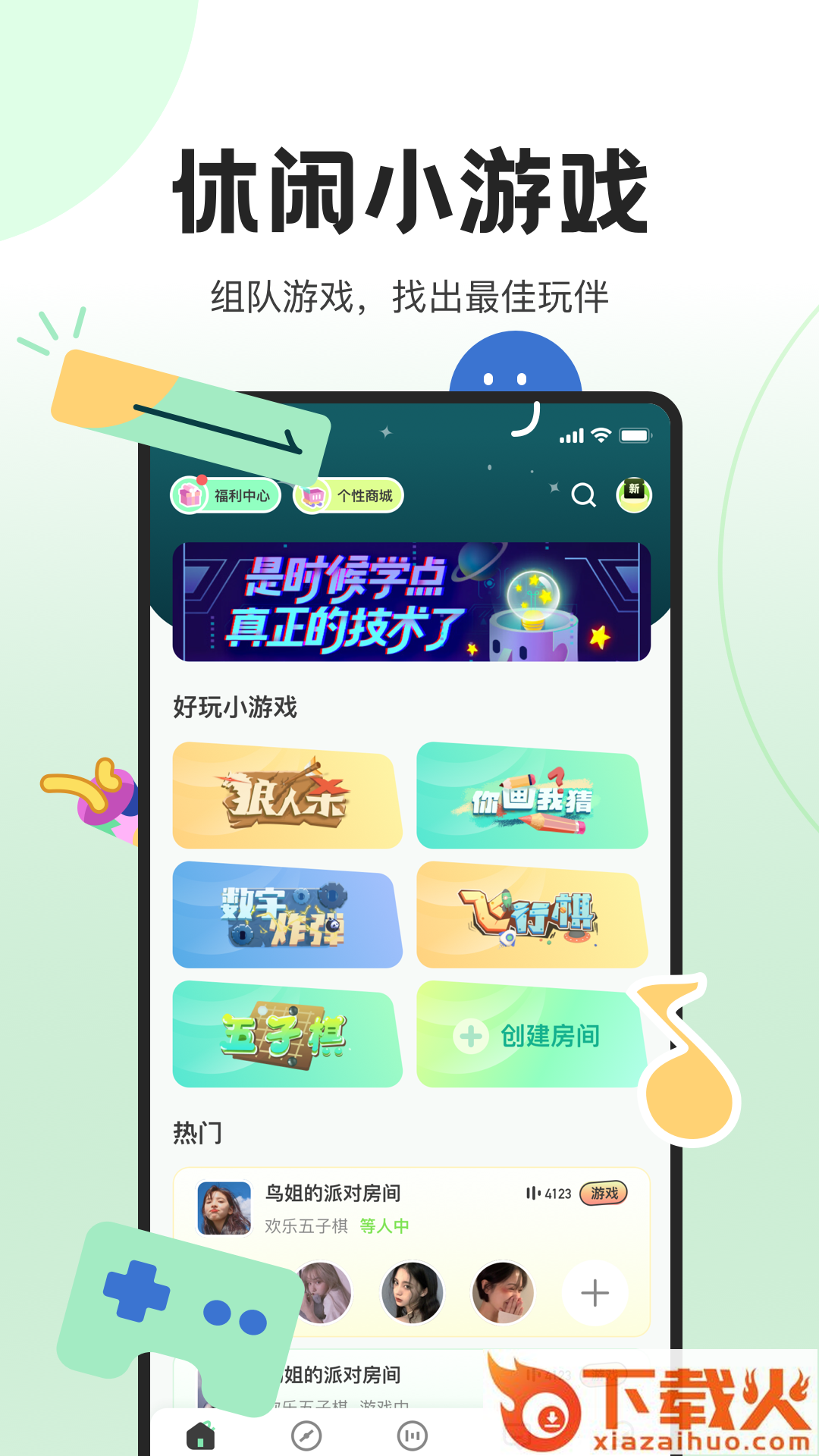 你画我猜、狼人派对、飞行棋、五子棋、数字炸弹多种休闲小游戏等你来玩~