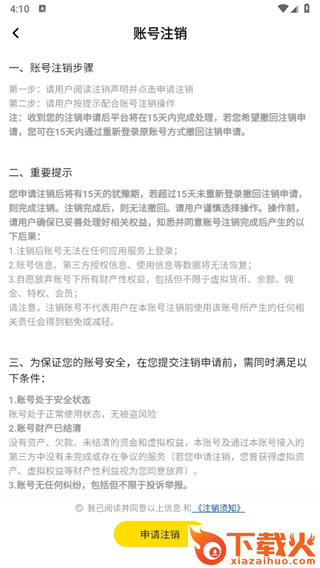 6、最后来到账号注销的页面中我们点击【申请注销】即可;