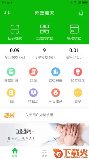 超盟商+统筹管理,账目清楚,营收了然,数据分析,智能参谋,语音报账,繁忙无漏,操作流畅,使用舒适,简单明了,全新界面,商户收款的灵魂伴侣。...