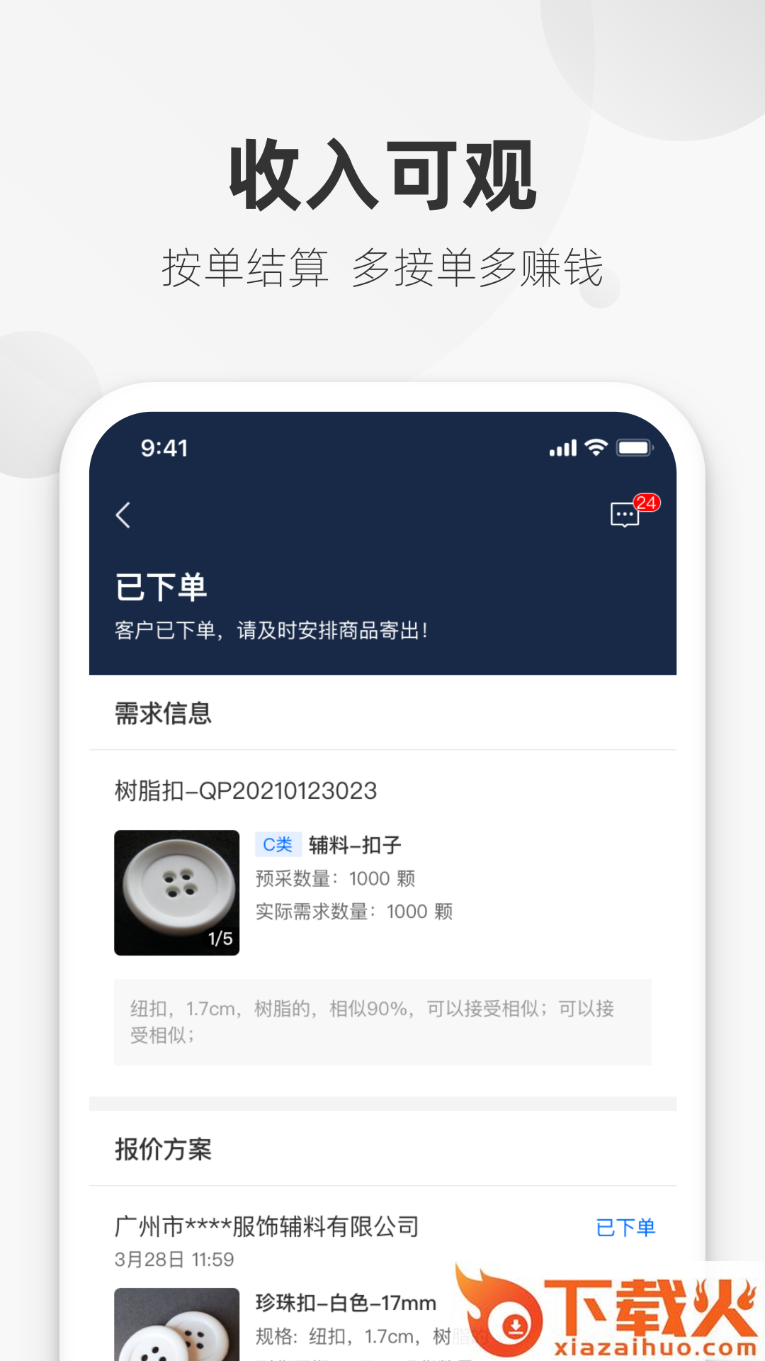 辅料易专家版App,为辅料提供专家服务;找版报价,在线沟通,及时反馈;时间自由,随时随地,接单赚钱;海量订单,精准分发,实时更新;收入可观,按单结算,多接单多赚钱。...