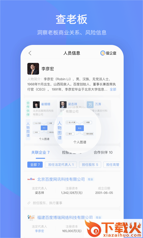 2、老板信息:个人图片、商业角色、所有企业、合作伙伴等