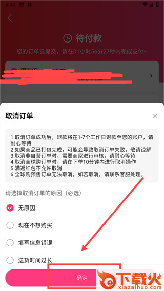 5、最后点击过后在页面下方会弹出一个取消订单的对话框,我们勾选上原因之后点击【确定】即可;