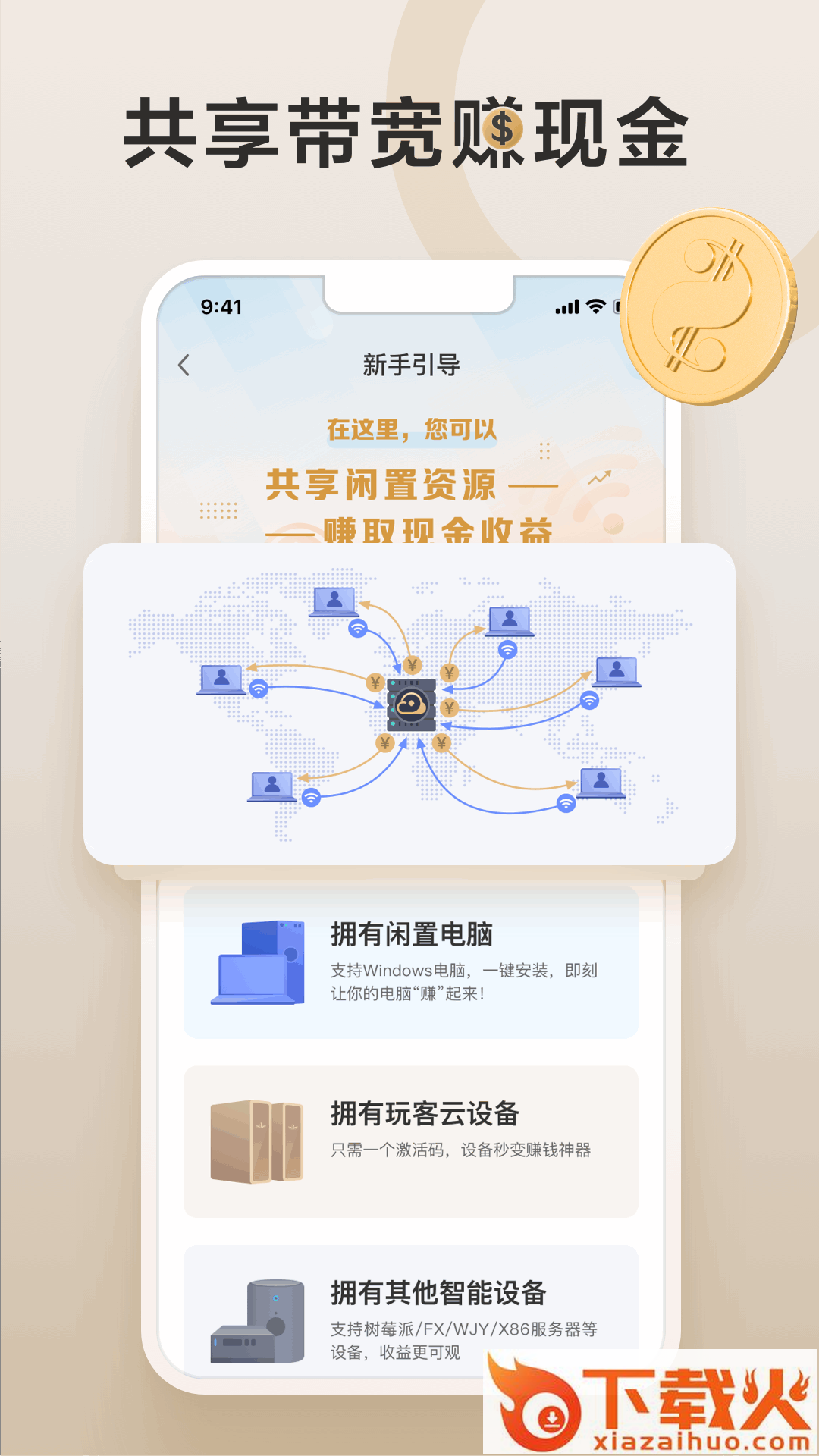 在移动、电信、联通运营商的网络带宽下,共享家庭闲置宽带可以让您获得现金收益。采用现金的方式进行激励, 激励额度根据用户实际贡献的上行流量、硬盘空间以及在线时长等进行结算。