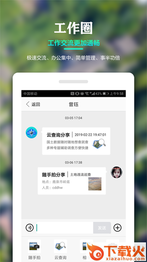 4、【工作圈】借助工作圈建立覆盖全国所有层级的管理用户群,可在工作圈进行任务安排、交换工作信息、反馈和共享调查信息,解决任务安排沟通困难、多人外业调查信息共享困难等问题。
