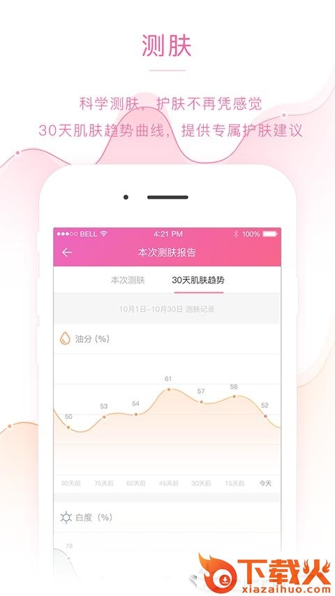 通过手机上传肌肤照片或佩戴光膜仪器,云端分析得出包括肌龄、油分、白度、毛孔等详细的肌肤数据。