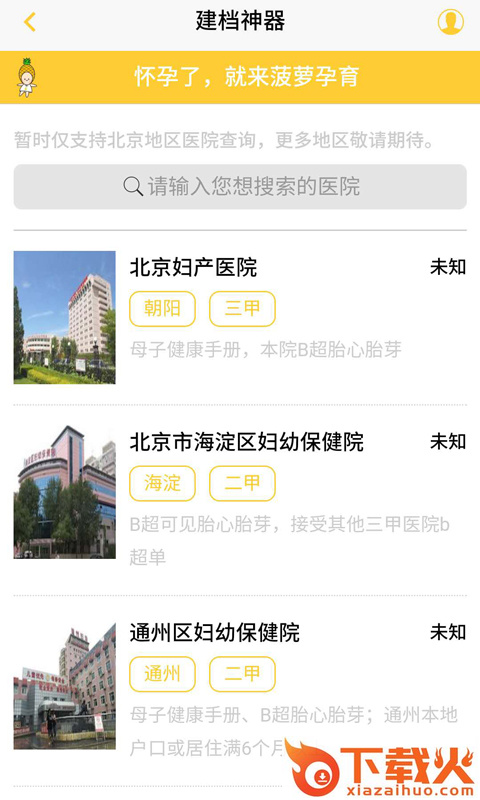 一站式查询三甲医院产科建档条件、建档流程、建档注意事项、医院产检项目等超全建档攻略,孕妇还可以在菠萝孕育后台设定自己的建档医院,免费获取该医院的产检项目时间表、医院资料库。