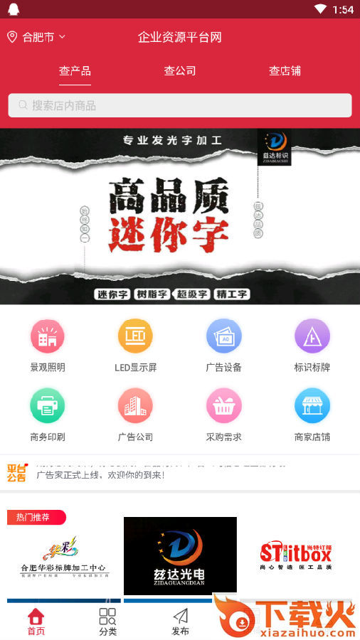 企业资源平台网app,提供了景观照明、LED显示屏、广告设备、标识标牌、商务印刷、广告公司、采购需求以及商家店铺等频道,各企业需要相关资源的话尽可到此来取哦!