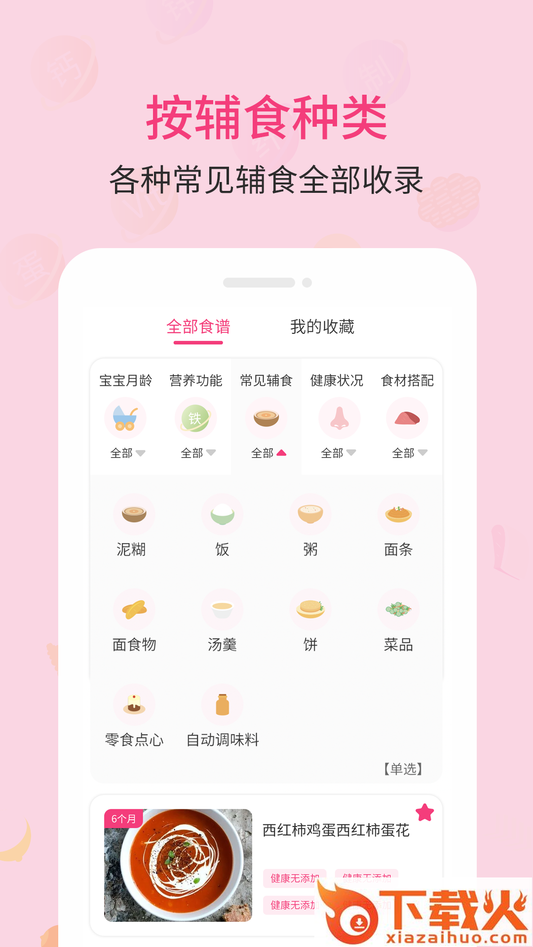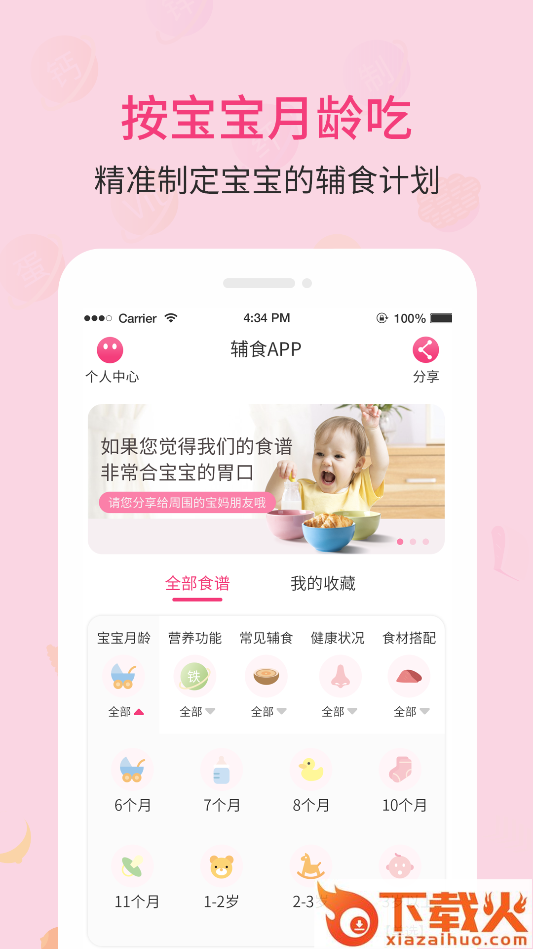 婴树宝宝辅食食谱app,按宝宝月龄吃,精准制定宝宝的辅食计划;按营养功能给宝宝吃,上百种健康辅食食谱;按辅食种类,各种常见辅食全部收录;收藏食谱,记录宝宝的喜好。