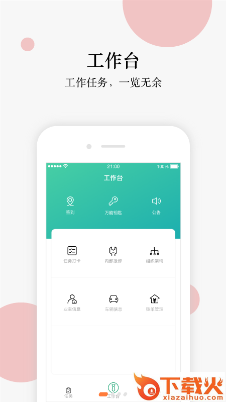 光合物管是一款专为物业从事人员打造的一款物业管理服务app。使用光合物管app,就能帮助你更加便捷的展开日常工作。有签到打卡、万能钥匙、工作台等功能,有需要的朋友快来下载吧!