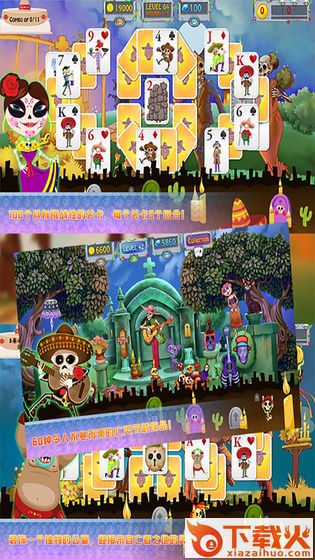 亡灵节纸牌中你需要在游戏中装饰墓地欢迎来自死者之地的灵魂;游戏还包含超过35张收藏卡,你可以定制你自己的卡牌;还有100挑战级别与3轮卡- 300独家布局,增加挑战的许多障碍。