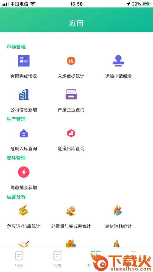 光大绿色环保app,企业移动办公服务平台,支持市场管理、生产管理、安环管理、运营分析等功能,还能随时查看通知公告以及待办事项,提高办事效率。