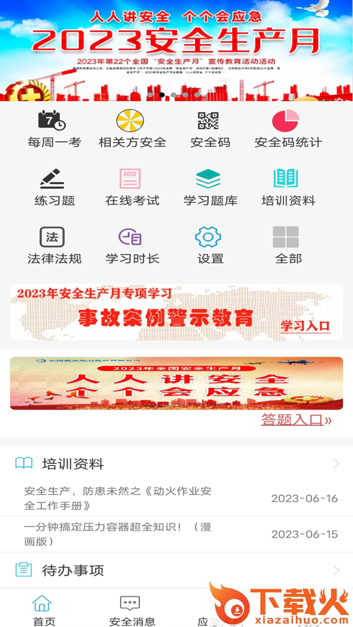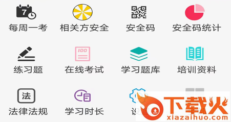 功能包括: 每日一题、学习题库、在线考试、测评问卷、法律法规、培训资料、安全公告、安全环保动态等功能。