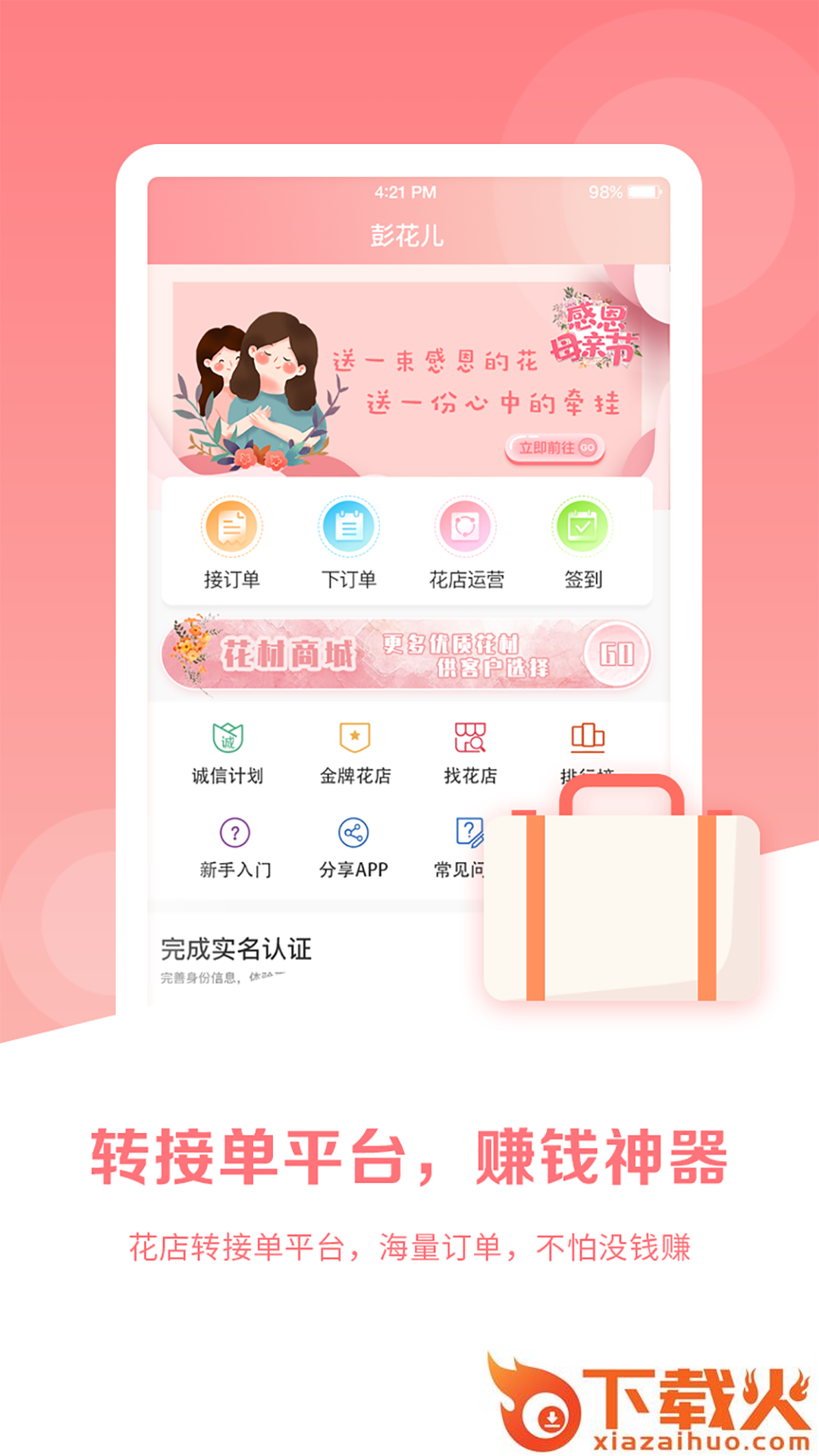 彭花儿app下载,一款高品质高效率的转接单平台,以鲜花批发速递为主,彭花儿app订单丰富推送及时,除了鲜花还有水果、蛋糕等转接单,有需要就来下载。