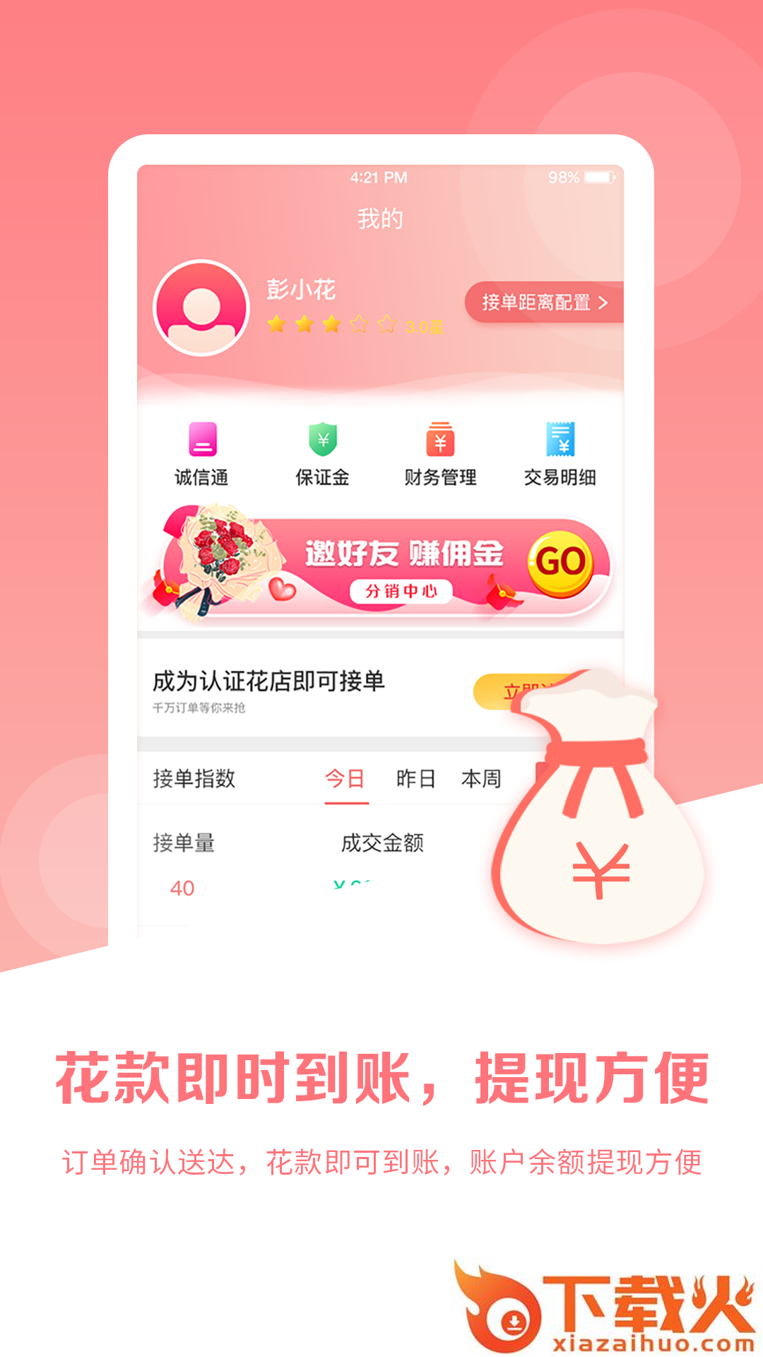 订单确认送达,花款即可到账,账户余额提现方便;